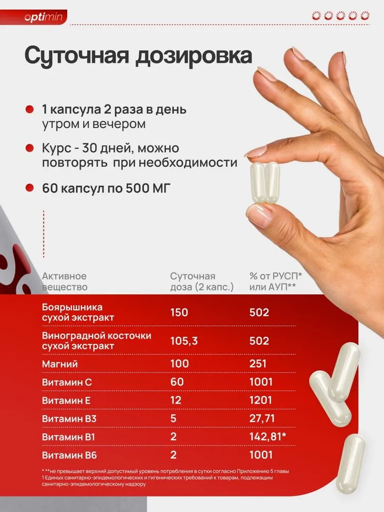 Боярышника сухой экстракт, виноградной косточки сухой экстракт, чеснока сухой экстракт, магния цитрат, витамин С, валерианы корня сухой экстракт, коры лиственницы сухой экстракт, мяты сухой экстракт, березы листа сухой экстракт, шиповника сухой экстракт, пустырника сухой экстракт, колеус форсколии сухой экстракт, спорыша сухой экстракт, аира корня сухой экстракт, фукуса сухой экстракт, астрагала сухой экстракт, витамин Е, шлемника сибирского сухой экстракт, витамин В3, витамин В1, Витамин В6; вспомогательные компоненты: капсула (гидроксипропилметилцеллюлоза, вода), агент антислеживающий (диоксид кремния), наполнитель (мальтодекстрин).