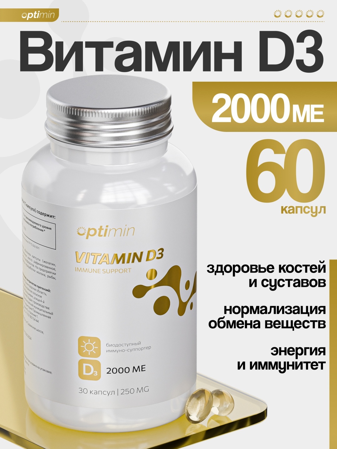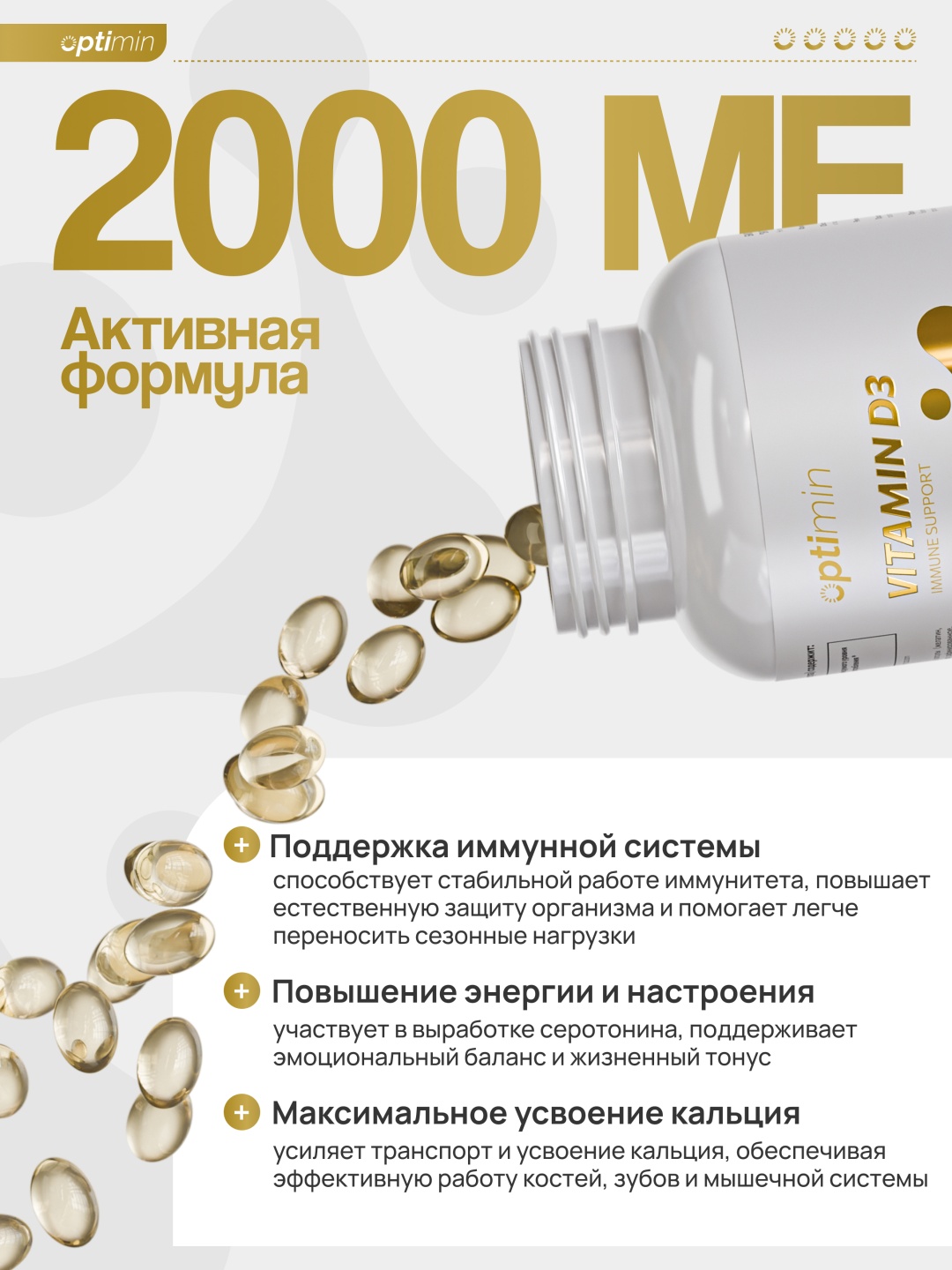 Высокобиондоступная форма витамина D3 (холекальциферол), созданная для поддержки иммунитета, улучшения обмена веществ и укрепления костно-мышечной системы. Стимулирует работу иммунных клеток, усиливает естественную защиту организма и помогает легче переносить сезонные нагрузки.