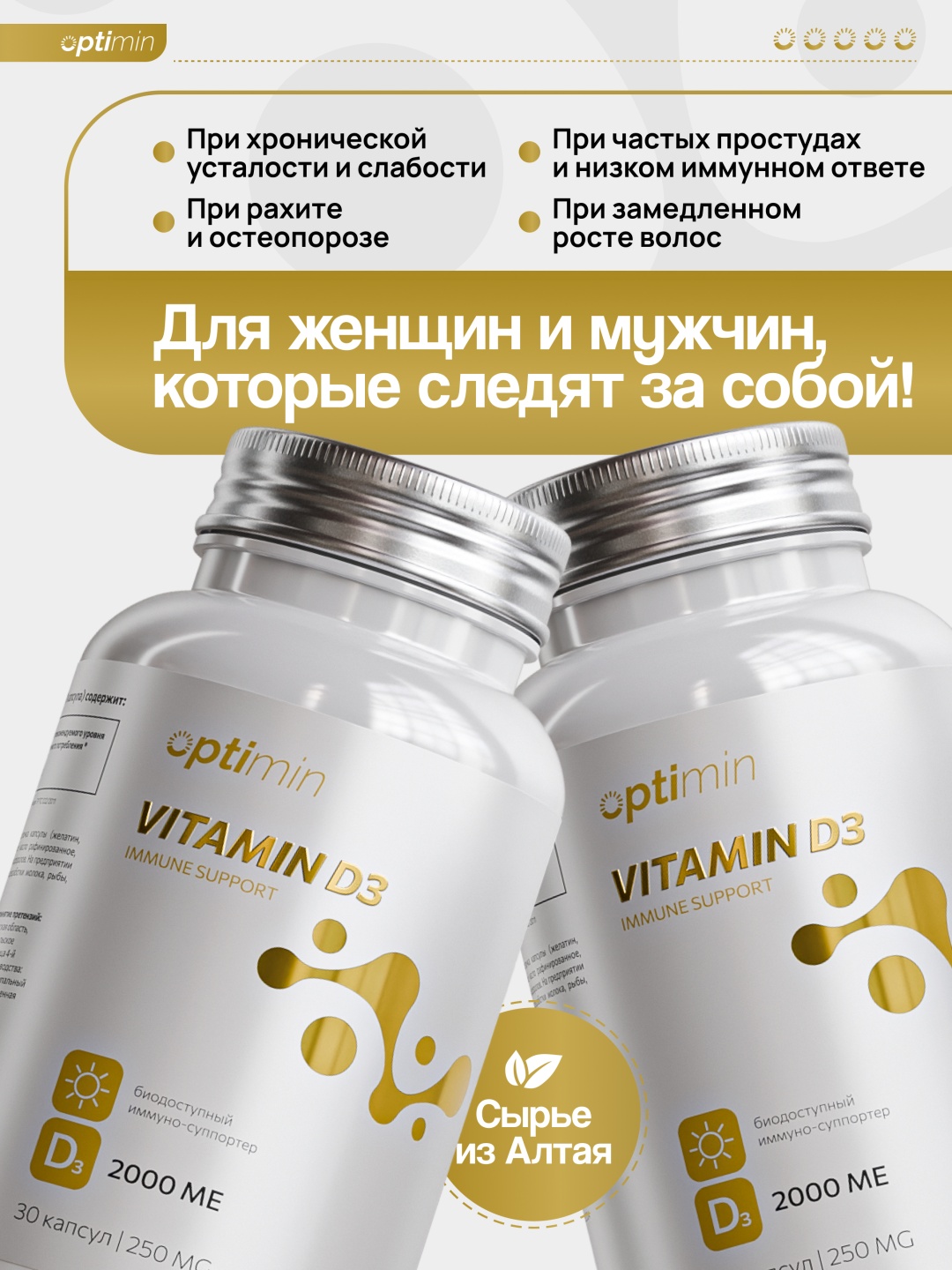 Высокобиондоступная форма витамина D3 (холекальциферол), созданная для поддержки иммунитета, улучшения обмена веществ и укрепления костно-мышечной системы. Стимулирует работу иммунных клеток, усиливает естественную защиту организма и помогает легче переносить сезонные нагрузки.