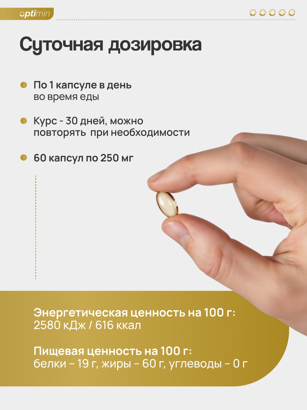 Севое масло рафинированное, оболочка капсулы (желатин, загуститель - глицерин, вода), подсолнечное масло рафинированное, холекальциферол, антиокислитель - смесь токоферолов